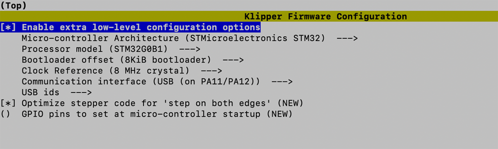 使用 ssh 连接到 Klipper Host. 然后使用以下命令进入 Klipper 目录。并且使用 make menuconfig 配置固件。