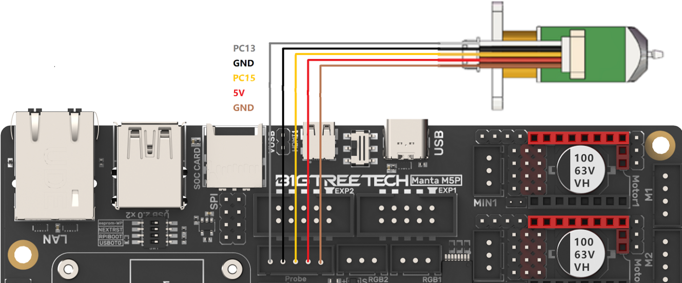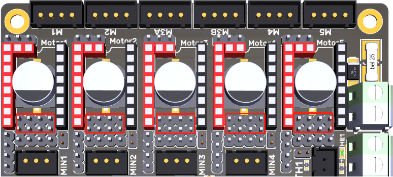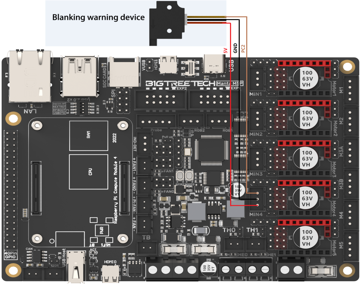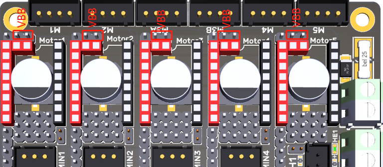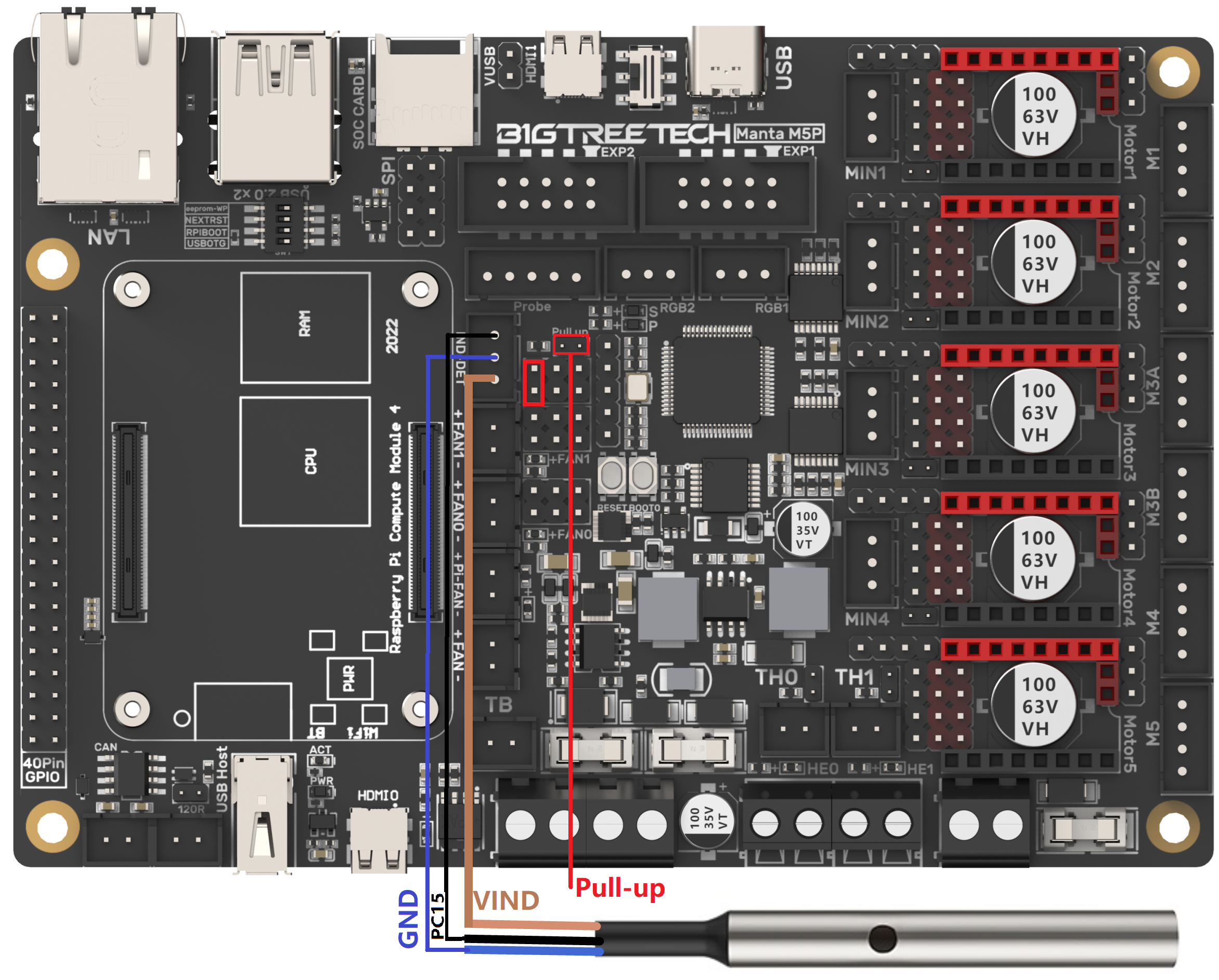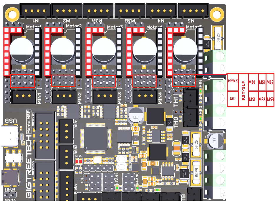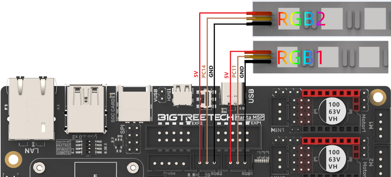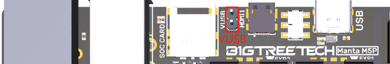 MANTA M5P通电后,MCU左侧的红灯D22将亮起,表示已通电。当仅使用USB为板供电或通过USB供电时,请将跳线帽插入VUSB。